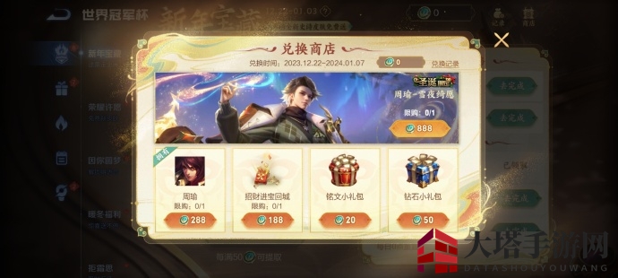 积攒至888宝藏币,即可兑换周瑜圣诞限定皮肤。