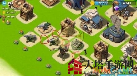 每个建筑之间最好保持一格间隙,以避免弹药同时伤害到两个建筑。地雷可埋设在部队必经之路,正面进攻至少需使用信号弹,以摧毁防御建筑。若拆掉防御建筑后没有信号弹,部队将自动选择最近的金币采集器进行进攻。此时,若对手未计算好弹药量,将陷入被动局面。