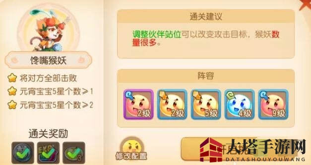 1、第五关·馋嘴猴妖,挑战要点:全灭敌人,元宵宝宝5星个数≥2